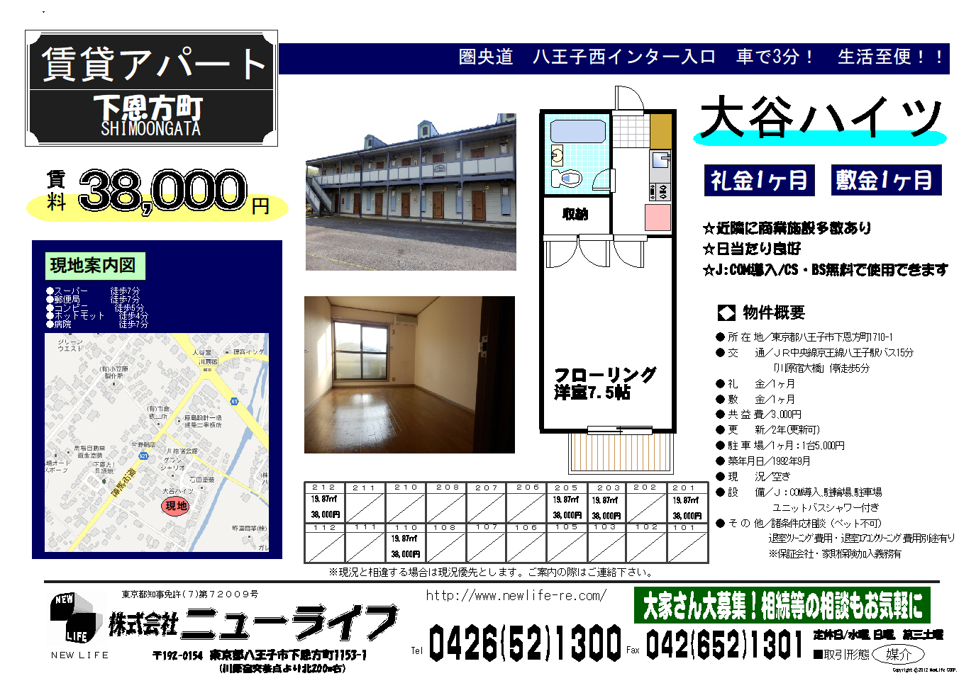 | 備考 | ワンルームアパート。洋室7.5帖の広々フローリング。圏央道八王子西インターへ車で1分の好立地。お弁当屋さん、コンビニまで徒歩5分!J:COM導入/CS・BS無料で使用できます。 内見可。2月上旬より入居可!!! |